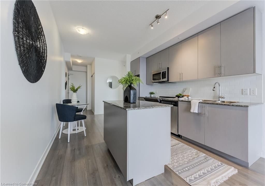 This tall modern sophisticated open concept condo is in the heart of downtown Kitchener with a welcoming concierge main lobby service. Unit 1404 is a corner unit with multiple views that shows excellent and is well presented with beautiful flooring, cabinetry, a large granite movable island and floor to ceiling stylish windows. Owned locker and underground parking space. The multi views from the large covered open balcony has southerly/easterly exposure showing off Kitchener's beautiful landscape. The LRT public transit system is just steps away as well as all other amenities including cafes, restaurants, shopping, +++. Gym access is available for 85 Duke St W owners in the abutting building at 55 Duke St W. Key Fob is in the lockbox. Excellent location close to all amenities, fabulous curb appeal, and tremendous views! NOTE 1: Condo Fee of $826.60 includes : Building Insurance, Building Maintenance, C.A.M., Common Elements, Ground Maintenance/Landscaping, Parking, Property Management Fees, Water. NOTE 2: The seller's monthly utility is $50 - 60 per month in the warm months and $100 - 110 per month in the cold months. NOTE 3: There is also a quarterly bill for storm water, which is $25 for a total of $100 per year.