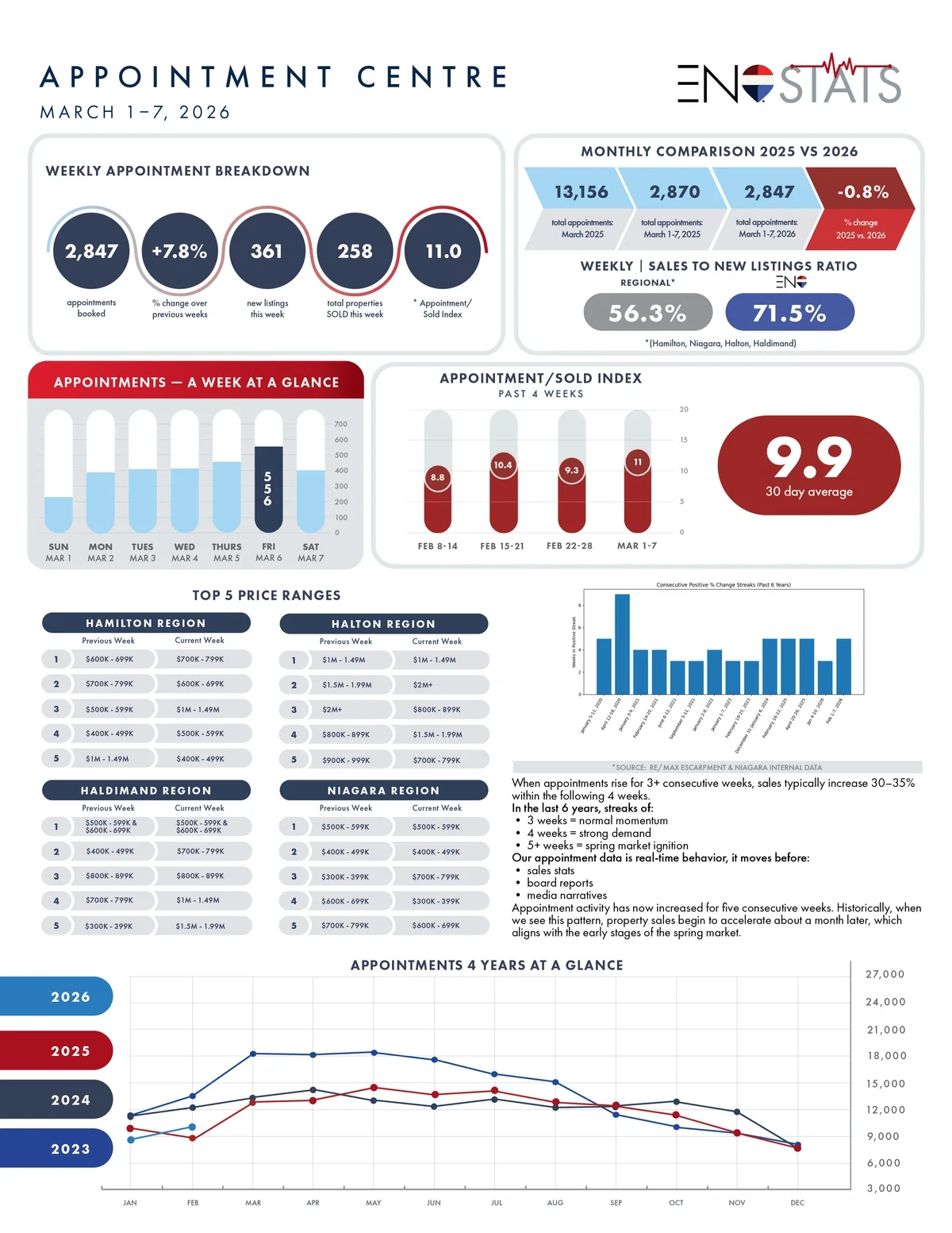 Appointment activity has now increased for five consecutive weeks. Historically, when we see this pattern, property sales begin to accelerate about a month later, which aligns with the early stages of the spring market.